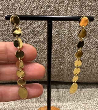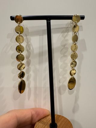Sin estrenar. No tenían etiqueta.Pendientes largos de 11 cm con un diseño de cadena fina y un acabado metálico ovalado. No pesan. Incluyen la bolsita de organza negra