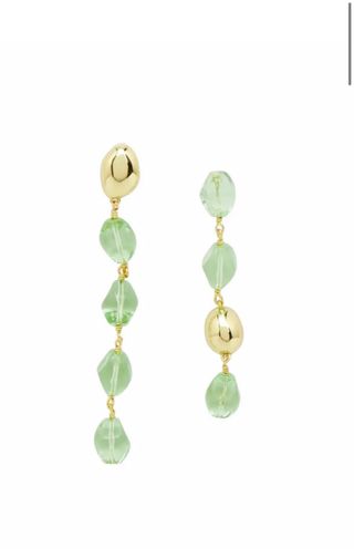 Pendientes originales de la marca COS, modelo largo con cuentas de vidrio en tono verde suave y detalles dorados.