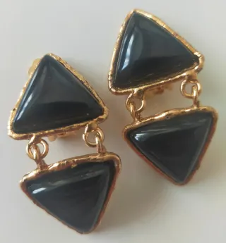 Preciosos pendientes largos de clip de la creadora Sylvia Toledano. Eslabones triangulares articulados con marco brutalista en metal dorado y gran cabujón negro triangular. Cierre de clip. Miden 5,2 x 2,5 cm. Cierre de clip. Uno de ellos firmado al reverso con el logo monograma ST de Sylvia Toledano. Vintage en muy buen estado, pueden tener alguna ligera marca del paso del tiempo (ver fotos). Sin embalaje original.