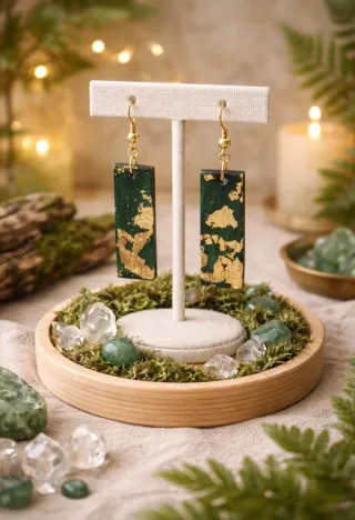 Pendientes en forma de palo alargado en tonos verdes, marrones y dorados imitando el camuflaje. De arcilla polimerica y cierres de acero inoxidable en color dorado. No pesan.