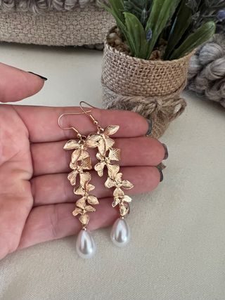 Pendientes dorados de hojas y perla. Largo de 7cm. Muy favorecedores y fáciles de poner. A estrenar.