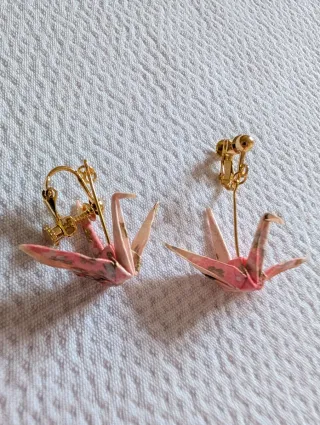 Pendientes artesanales japoneses, comprados en Kyoto, con delicadas grullas de origami hechas a mano en papel washi tradicional, en tonos rosa empolvado y dorado. Montura metálica tipo clip ajustable, ideal también para orejas sin agujero. Son ligeros, únicos y completamente nuevos — una joya simbólica que representa la paz, la suerte y la prosperidad. ✨ Detalles: Hechos a mano en Japón Materiales: papel washi y metal dorado Colores: rosa empolvado con toques dorados Largo aprox.: 3,5 cm Cierre: clip ajustable (sin agujero) Estado: nuevo, sin estrenar Origen: Kyoto, Japón #Origami #PendientesJaponeses #HechoEnJapón #Kyoto #