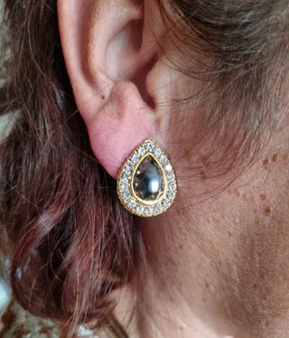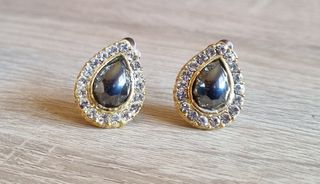 PRECIO A CONVENIR (sobre todo en lote con otros productos). Elegantes pendientes dorados con diseño de lágrima con detalle de circonitas alrededor de la gema central oscura. Cierre en clip. Largo 2.5cm y ancho 2cm.