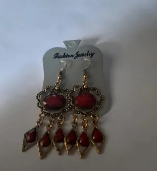 Preciosos pendientes de acero bañado en oro y cristal facetado rojo . Hipoalergénicos . Longitud 4,2 cm y ancho ( en la piedra más ancha) 1,5 cm. Están nuevos . Llevan tres cristales rojo intenso facetado dos circulares iguales y otro más grande en forma de lágrima . Cierre de mariposa a presión .