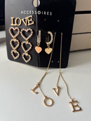 Conjunto de pendientes (7 largos y 8 cortos) con un diseño único y elegante. - Pendientes colgantes con detalles en espiral y abalorios. - Pendientes de clip con forma ovalada y detalle de corazón. Precio mostrado para todo el lote.