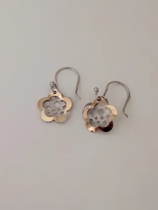 Pendientes de plata 925, diseño flor calada con piezas superpuestas en dos tonos (plata y baño dorado suave). Muy ligeros, con movimiento y un brillo precioso. Plata auténtica Super cómodos Perfectos para diario o para dar un toque especial Medidas – Largo total aprox.: 2,8 cm – Diámetro de la flor: 1,5 cm Estado En muy buen estado, con el desgaste normal de la plata (lo típico que se pule si se quiere dejar espejo). #plata925 #pendientesplata #joyeria #accesorios #doscolores #flores #minimalista #joyas