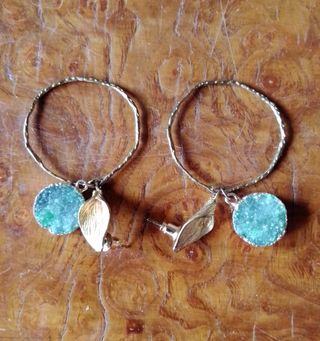 Elegantes pendientes de aros y hojas dorados y colgantes de jade verde con un diseño único. 5 cm de largo.