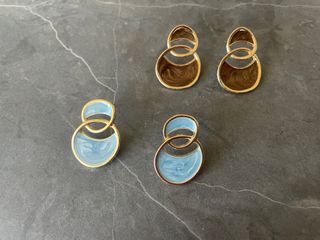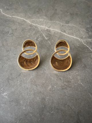 Pendientes con un diseño de doble aro y acabado esmaltado. - Diseño moderno y elegante. - Combinación de tonos azul y dorado. Incluye un regalo de otros pendientes idénticos en tono marrón chocolate. 3 cm de largo.