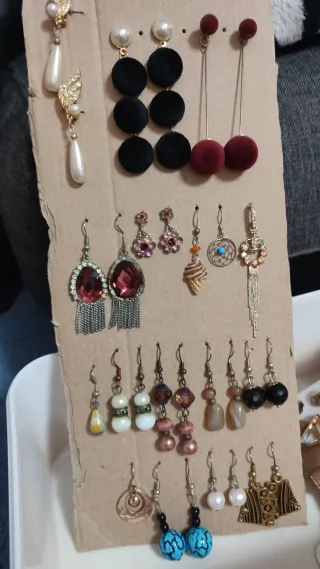 Conjunto de pendientes de diferentes estilos y diseños. Algunos desparejos. Los demás con su pareja. Vendo sueltos o por lotes!! Muy baratos porque no me quedan más!! Algunos usados - Pendientes largos con perlas y detalles dorados. - Pendientes con cuentas negras y borlas rojas. - Pendientes con piedras rojas y cadenas plateadas. - Pendientes con cuentas blancas y detalles metálicos. - Pendientes con cuentas de colores y formas variadas. - Pendientes con cuentas azules y negras. - Pendientes dorados con diseño tribal.