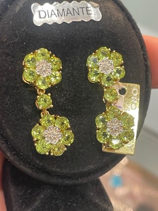 Elegantes pendientes largos con diseño de flor. - Elaborados en oro. - Detalle de olivinas y pequeños diamantes en el centro. - Cierre seguro para un uso cómodo.