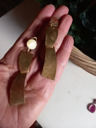 Elegantes pendientes largos con un diseño en forma de hojas color Marrón por detras bañados en color oro Muy Originales - Cuentan con un acabado dorado. - Incorporan piedras de color rojo intenso. - Diseño colgante con varias piezas. Solo hago envió Seleccióne Punto de Recogida de envío mas Cercano a su Zona y el importe de envío hay Varios Consultelos Tengo más cosas de Venta Visitalo dando Clic. al Logo del Perfil Ofertas