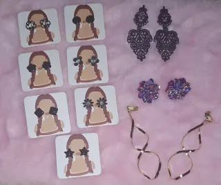 Conjunto de pendientes a estrenar, ideales para añadir un toque especial a tu look. - Pendientes con diseño de flor y detalles brillantes. - Pendientes con forma de estrella. - Pendientes cuadrados. - Pendientes largos dorados con diseño de espiral. - Pendientes negros de filigrana.
