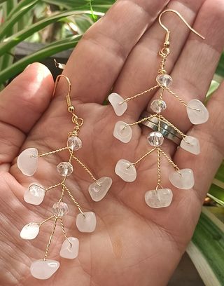 Pendientes hechos a mano con un diseño delicado y elegante. - Cuentan con pequeñas piedras naturales. - Detalles en alambre dorado. Largo aproximado 8 cm Más artículos disponibles en mi perfil. Atrapasoles, conjuntos de joyería,arboles de la vida, pulseras....