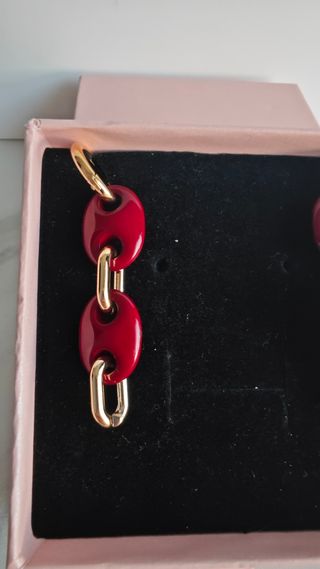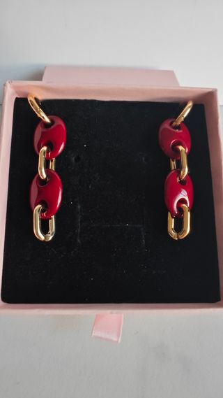 Pendientes burdeos de eslabones de acero inoxidable. Nuevos a estrenar. No pesan prácticamente nada. Mide 6cm de largo por 1,5cm de ancho. No está incluida la caja. Se envía en una bolsita de gasa.