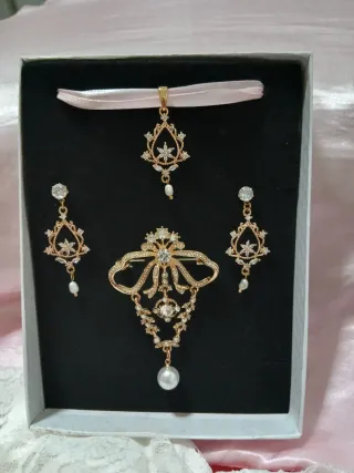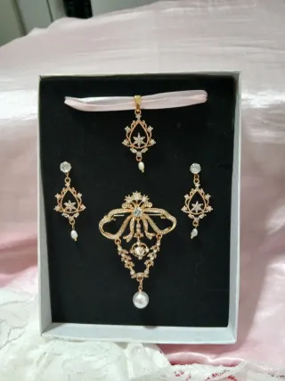Preciosa joya para traje regional. Incluye un broche,6cm ancho por 11cm largo en cristal, colgante con cinta y un par de pendientes.8cm nuevo sin estrenar El conjunto está en perfecto estado y luce elegante. - 2 Broches y colgante con diseño de lazo y detalles florales. - Pendientes colgantes con diseño a juego. - Piezas con cristales blancos y perlas artificiales,rf.0082