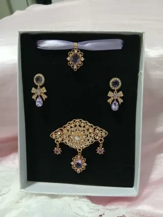 Conjunto de aderezo para trajes regionales infantiles. - Diseño con detalles circonia morada - Incluye pendientes 3cm, colgante.y broche 3,5cm ancho por 4cm largo - Adornos en tonos morados y transparentes.RF0287