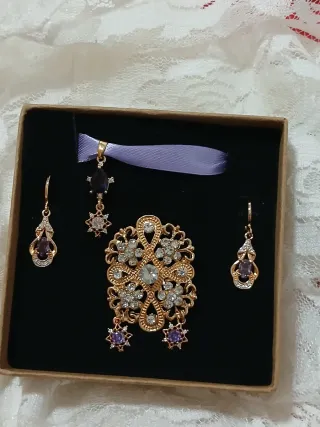 Preciosa joya de estilo huertana, ideal para complementar tu atuendo regional. El conjunto incluye un broche6cm ancho por 9cm largo, nuevo artesanal un par de pendientes 6.5cm. Y colgante - Diseño elegante y sofisticado.hecho a mano - Broche y pendientes a juego. - Piezas delicadas y brillantes.rf0170