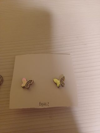 Pendientes de cereza , pendientes de mariposa nuevos ,pendientes largos de hojas , pendientes dorados y pendientes negros en buen estado ,pendientes de mano de fatima largos y pequeñosCADA UNO 5€ MENOS LOS NEGROS 2,50€ CADA UNO.