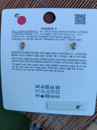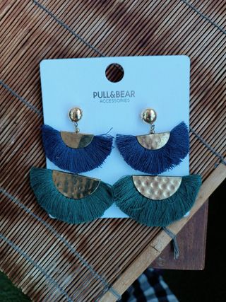 son largos dorados con dos medias circunferencias cada uno una azul y otra más grande en verde de hilo