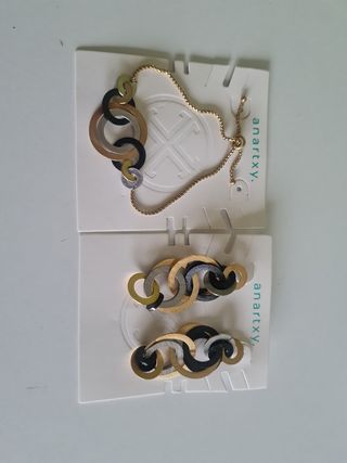 Conjunto de pulsera con cierre corredero y pendientes largos muy originales con circulos diferentes tamaños concentricos en color dorado plata y negro me los puse solo para una boda.los vendo juntos o por separado site interesa solo pulsera 30 o solo pendientes 40
