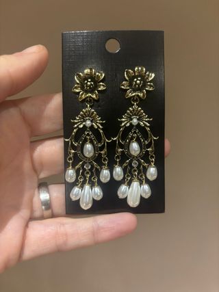 Elegantes pendientes largos de estilo vintage. - Diseño con motivos florales. - Cuentas en forma de lágrima. - Detalle de pequeñas perlas y cristales. color oro envejecido con perlas y cierre presión largos nuevos sin estrenar