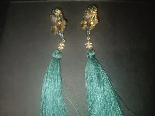 Elegantes pendientes largos de bisutería con un diseño llamativo. - Detalle de pedrería en tonos verdes y transparentes. - Colgante de borla en color verde esmeralda. - Cierre de clip o presión.