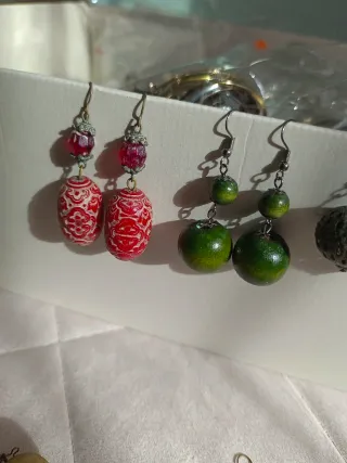 Conjunto de pendientes llamativos con cuentas y adornos. -Precio por unidad 3 euros -3 pares por 7 euros - Pendientes con cuentas rojas y adornos blancos. - Pendientes con cuentas verdes y adornos metálicos.