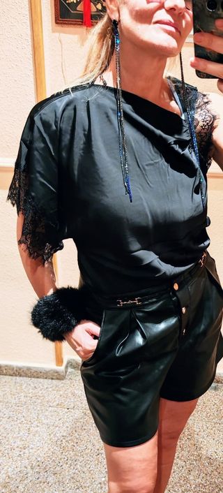 Pendientes de fiesta espectaculares y muy largos, perfectos para looks elegantes o de noche. ¡Ideales para añadir un toque dramático. ✨ Características Principales Diseño: Pendientes muy llamativos con una base en forma de lazo/moño hechos completamente de abalorios tubulares y redondos negros brillantes. Colgante: Cuentan con un diseño de flecos extralargos y gruesos que caen de forma elegante, compuestos por múltiples hilos de abalorios negros. Tipo de Cierre: Cierre de pinza o clip (no necesitan agujero), con un tono de metal cobrizo/dorado en la parte trasera. Color: Negro profundo y brillante. El modelo lleva unos pendien