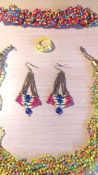 Preciosa colección de bisutería africana. Incluye un collar, un par de pendientes, un anillo y una pulsera. Todas las piezas son multicolor y presentan un diseño llamativo. - Collar largo con múltiples hileras de cuentas. - Pendientes colgantes con bonitos detalles. - Anillo de resina transparente. - Pulsera a juego con el collar. Además se incluye la cajita de regalo para guardarlas.
