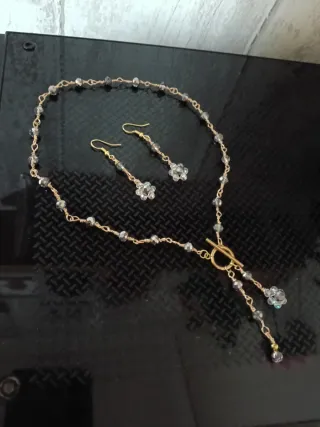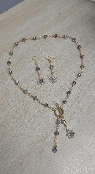 Elegante conjunto de collar y pendientes. - Collar con cierre en T de acero inoxidable y detalles de cuentas de cristal tonos grises. - Pendientes a juego con diseño floral y gancho hipoalérgico.. - Fabricado con alambre dorado indecorable. Largo collar 40 + 5 cm aprox. Largo pendientes 6 cm aprox. No olvides visitar mi perfil con gran variedad de artículos.