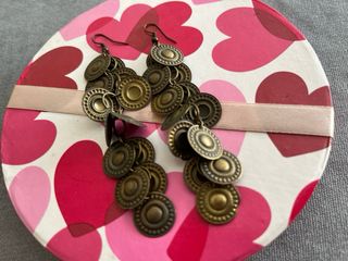 Conjunto de tres pares de pendientes con diseño que evoca piezas antiguas. Muy poco uso. En muy buen estado. - Primer par: pendientes largos (aprox.4,5 cms) de cierre abierto con embellecedor imitación cobre de diseño floral adornado con tres piedras de distintos colores. Colgante principal con piedra ovalada, facetada, de color granate. - Segundo par: pendientes con cierre de palanca, imitación técnica filigrana con motivo central de rosetón o flor, adornado con pequeñas piedras de color turquesa. - Tercer par: pendientes con cierre de palanca y media esfera color marfil (con vetas sutiles) y acabado bronce antiguo.