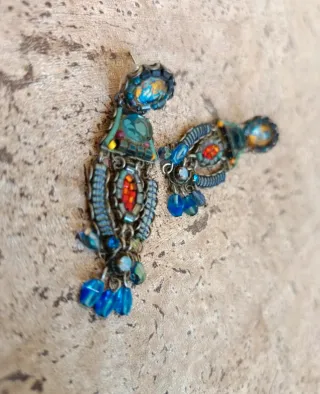 Pendientes largos con un diseño intrincado y detalles coloridos. - Combinación de tonos azules y rojos. - Cuentas y abalorios. - Cierre de presión.