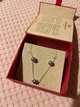 Elegante conjunto de collar y pendientes de la marca Majorica. Las perlas tienen un bonito tono grisáceo y la cadena es plateada. - Diseño clásico y atemporal. - Cierre seguro para el collar. - Pendientes a juego con el collar.