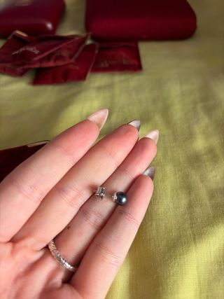 Elegantes pendientes de la marca Majorica con perlas negras y detalles plateados. Vienen en su estuche original. - Perlas de color negro. - Cierre de tuerca Nuevos