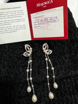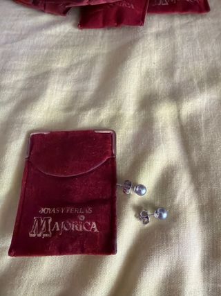 Elegantes pendientes de la marca Majorica. - Diseño con perlas y detalles plateados. - Incluye bolsa de tela para guardarlos.