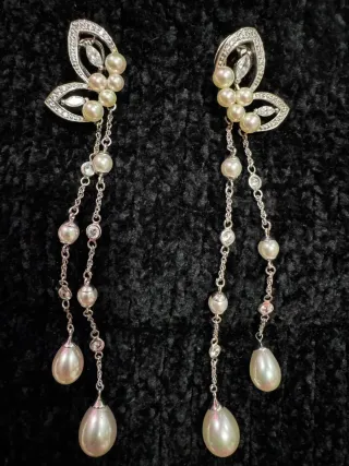 Elegantes pendientes largos con perlas de la marca Majorica y detalles en plata. - Diseño colgante con varias perlas. - Cierre seguro y cómodo.