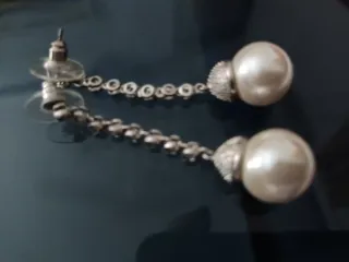Elegantes pendientes colgantes con detalles de plata y perlas. - Diseño colgante con cadena. - Perlas de gran tamaño. - Cierre seguro.