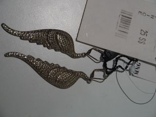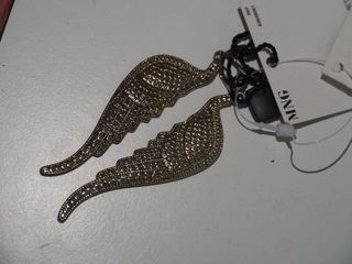 Pendientes con diseño de alas en tono dorado, con etiqueta y en su bolsita de terciopelo. Tengo 3 unidades de pendientes iguales.