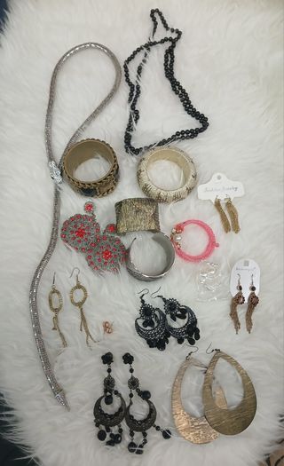 Conjunto de bisutería con varios accesorios. - Collar plateado con diseño de serpiente. - Collar largo de cuentas negras. - Brazalete ancho con detalles dorados. ( Mango ) - Brazalete tejido en tonos beige. - Brazalete metálico con textura y otro en dorado. ( Mango ) - Brazalete fino rosa con perlas. - Pendientes largos dorados con cadenas. - Pendientes grandes rojos con filigrana. - Pendientes negros con diseño. - Pendientes largos dorados con detalles rojos. ( en 1 pendiente le falta 2 brillos rojos ) - Pendientes largos negros. - Pendientes grandes dorados con forma de lágrima. - Un par de pendientes pequeños rosas.
