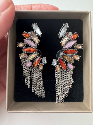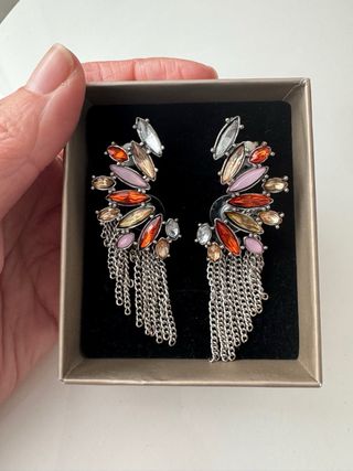 Preciosos pendientes tipo trepadores. De Mango. Usados en una sola ocasión. Cierre de tuerca en la parte del lóbulo y de clip arriba. De colores y con colgantes. Muy bonitos puestos.ñ, alegran cualquier look.