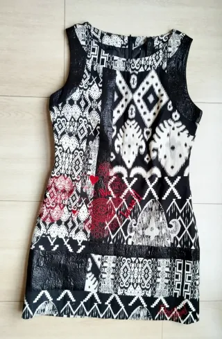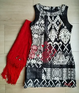 Vestido de la Marca Desigual con un diseño patchwork llamativo. Talla 40. - Estampado geométrico y floral. - Detalles en negro brillante. - Escote redondo. - Sin mangas. - Incluye chal rojo con flecos y pendientes. Ver más productos en mi perfil.