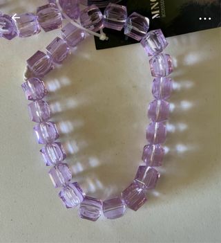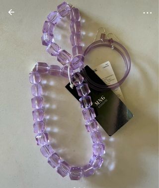 Preciosa bisutería de Mango en color morado. El conjunto incluye un collar, pulsera y unos pendientes. - Collar y pulsera de cuentas cuadradas transparentes con destellos morados. - Pendientes aros ligeros y delicados. - Perfecto para añadir un toque de color a tu look.