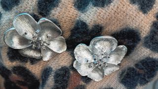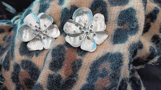 Preciosos pendientes de aro, de color plateado. Son dos pendientes con un diseño elegante y delicado. - Tienen forma redonda. - Presentan un diseño floral. - Son de metal.