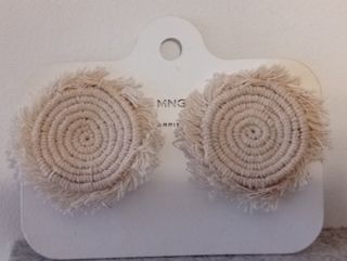Preciosos pendientes de Mango, ideales para el verano. Son dos pendientes redondos de color beige, con un diseño tejido y flecos. Están en perfecto estado.