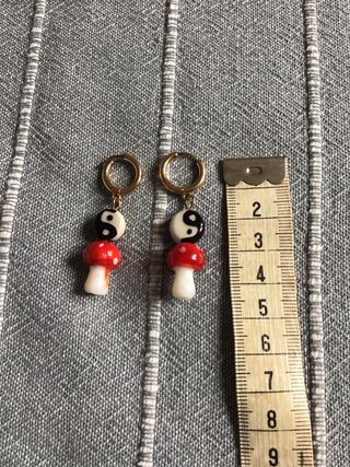 Originales pendientes colgantes con diseño de setas y símbolo Yin Yang. - Cierre de aro dorado. - Detalle de cuentas con diseño Yin Yang. - Colgante en forma de seta con detalles.