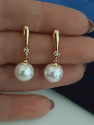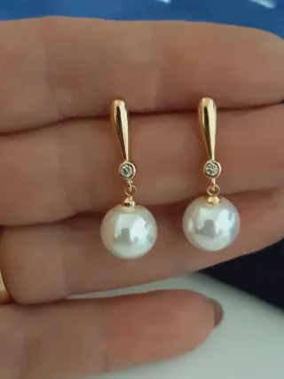 Elegantes pendientes con perlas blancas baño oro, resistente al agua, hipoalergénicos Nuevos sin uso - Diseño colgante con detalle de circonita. - Perlas de imitación - Cierre de presión.