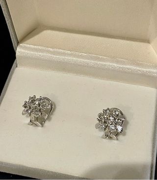Elegantes pendientes vintage en plata de ley (925) con diseño floral y piedras strass tipo circonita. Pieza de los años 70 en perfecto estado, están sin estrenar, no ha tenido uso. Cierre omega para perfecta sujección. Modelo similar a otros de la época realizados en oro blanco y brillantes, de hecho lo parecen. Exquisito trabajo de orfebrería. Preciosos.