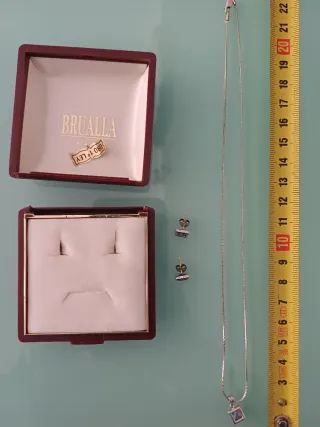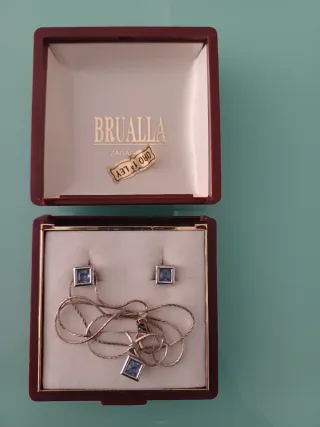 Conjunto de cadena, colgante y pendientes de oro blanco con piedra azul similar a zafiro La cajita tiene el cierre roto No dispongo de certificado de materiales