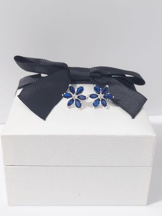 Conjunto de anillo y pendientes de la marca Pandora con un diseño de flor. - Anillo talla 54 (17.3 mm). - Pendientes a juego. - Detalles en color azul y plateado.