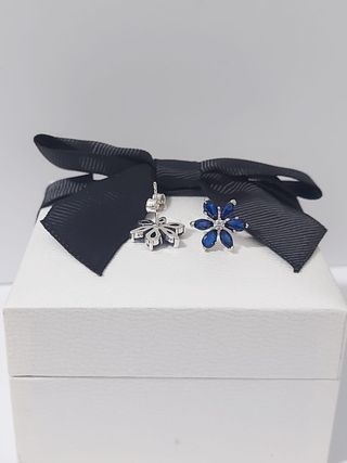 Elegantes pendientes de la marca Pandora con un diseño floral en tonos azules y detalles plateados. - Diseño de flor con pétalos en forma de lágrima. - Centro adornado con pequeñas circonitas blancas. - Cierre de presión seguro y cómodo.